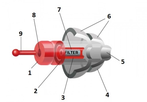 3. Filtr stożkowy z otworami wentylacyjnymi. Kształt i średnica kanału słuchowego decydują o stopniu pochłaniania dźwięku dla różnych częstotliwości.