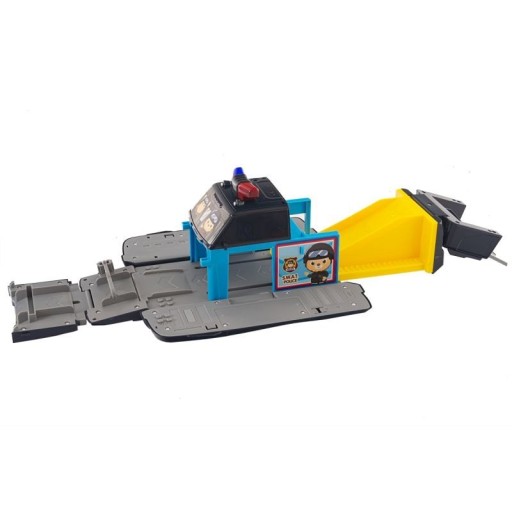 Zabawka samochód SWAT który zmienia się w parking policyjny z wyrzutnia dla samochodów. Garaż posiada centralną rampę pochyłą do rozpędzania pojazdów. Duży pojazd posiada napęd inercyjny