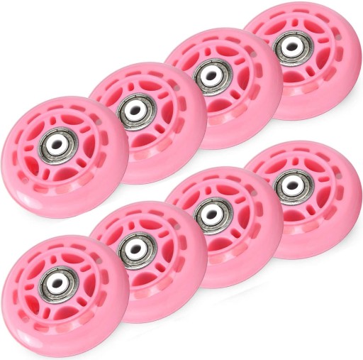 - Te kółka do wrotek są wykonane z wysokiej jakości materiału poliuretanowego, odpornego na ścieranie i mocnego. Konstrukcja ma twardość 82A, co może zapewnić długotrwałe doświadczenie użytkowania. Jego wysokowydajne łożyska zapewniają płynną i wygodną jazdę. Jeśli wewnętrzna klamra koła jest luźna, zaleca się włożenie odrobiny papieru między białą plastikową krawędź a łożysko, aby lepiej zamocować koło.
