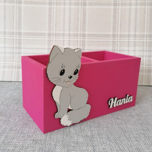 Przybornik został przez nas pomalowany na ciemno różowy kolor a jego dodatkową ozdobą jest namalowany przez naszych plastyków dekor oraz imię dziecka, które należy podać przy składaniu zamówienia