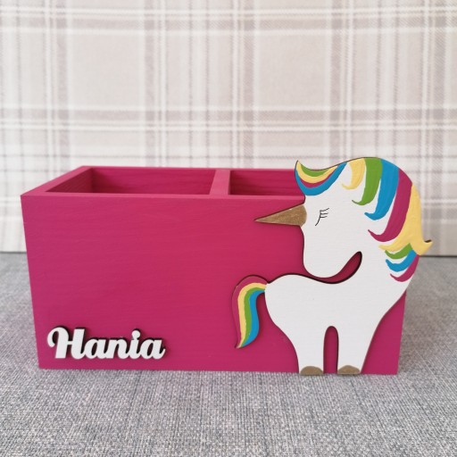 Przybornik został przez nas pomalowany na ciemno różowy kolor a jego dodatkową ozdobą jest namalowany przez naszych plastyków dekor oraz imię dziecka, które należy podać przy składaniu zamówienia.