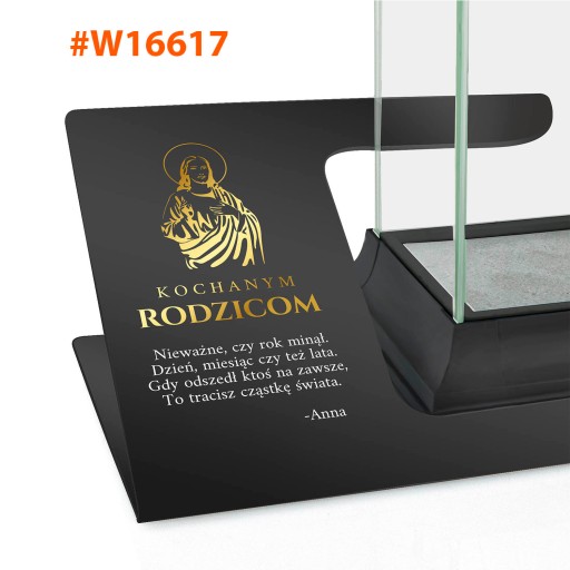 Podstawka wykonana zostały z solidnego metalu w kolorze czarnym, dzięki czemu całość jest odpowiednio ciężka i stabilna, co chroni przed wiatrem. Metal został przycięty w taki sposób, że wszystkie boki zostały gładko wykończone, a jego powierzchnia została polakierowana proszkowo. Od spodu zostało zamontowane 5 specjalnych podkładek filcowych, które zabezpieczają pomnik przed zarysowaniem. Do każdej podstawki dołączamy lampion, maksymalna wysokość wkładu który zmieści się w lampionie to 16 cm.