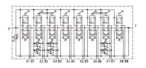 Rozdzielacz o schemacie otwartym, podczas gdy nie sterujemy żadną sekcją olej swobodnie przepływa przez rozdzielacz do kanału powrotnego (T).