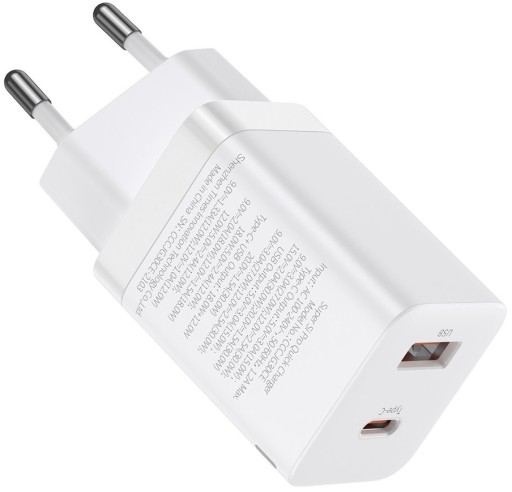 Baseus ładowarka sieciowa do urządzeń mobilnych USB + USB-C 3A Quick Charge 3.0, Power Delivery, 30W w kolorze białym