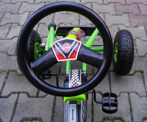 Pojazdem dziecko steruje samodzielnie siedząc za kierownicą i naciskając na pedała.