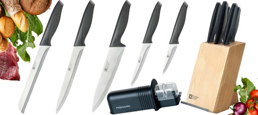 RICHARDSON ZESTAW 5 NOŻY W BLOKU DRWENIANYM + FISKARS OSTRZAŁKA