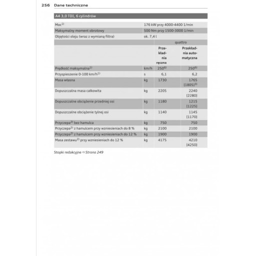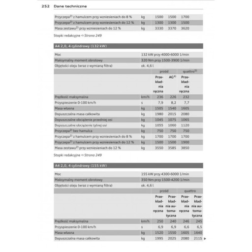 Instrukcja obsługi Audi zawiera wszystkie wersje wyposażenia oraz przydatne informacje jak sprawnie i bezpiecznie użytkować pojazd np.-wskaźniki, lampki kontrolne, otwieranie i zamykanie-oświetlenie i widoczność, fotele, schowki, ogrzewanie, wentylacja, klimatyzacja-jazda, wskazówki eksploatacyjne, konserwacja pojazdu-poziomy płynów, sprawdzanie i uzupełnianie, czynności awaryjne, wymiana kół, bezpieczniki, wymiana żarówek-dane techniczne... oraz wiele wiele innych rzeczy, które dają poczucie bezpieczeństwa oraz komfortu podróżującym .Polskie prawo nakłada na sprzedawcę obowiązek dołączania instrukcji obsługi auta w języku polskim do . Instrukcja obsługi auta jest nowa i w języku polskim.