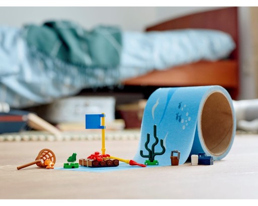 Miłośnikom LEGO® spodoba się morska zabawa zestawem akcesoriów Taśma z wodą (854065). Po rozwinięciu niebieskiej taśmy z falami dzieci mogą odgrywać na niej zabawne morskie historie z wykorzystaniem 10 akcesoriów, takich jak żaba, ryba, krab, wodorost i tratwa. Pomysłowe dzieciaki spędzą na tej zabawie długie godziny.