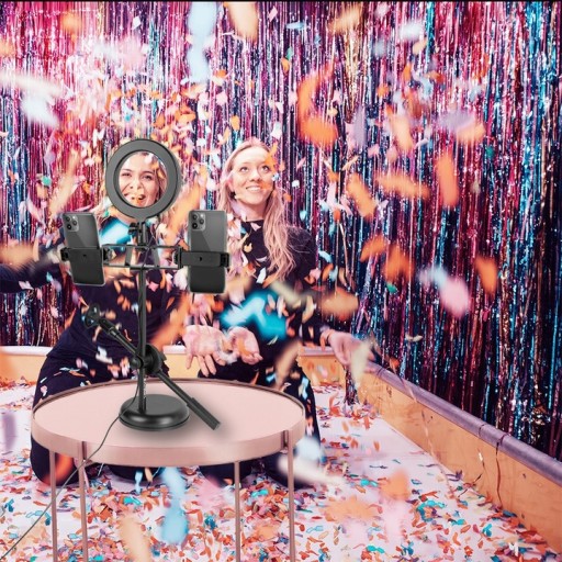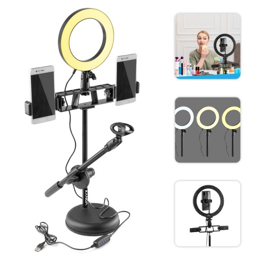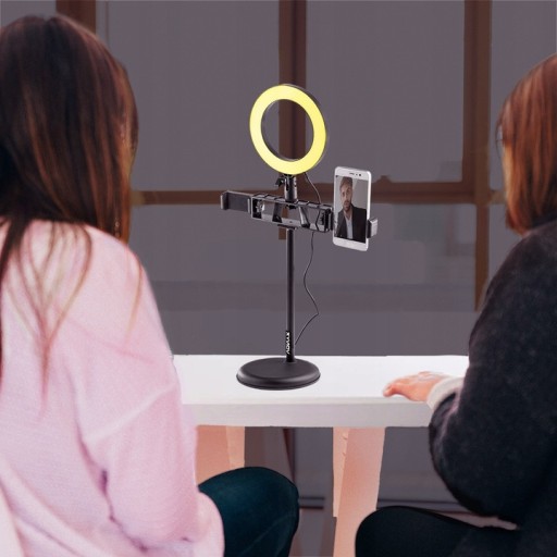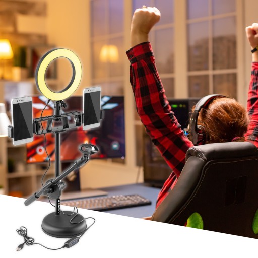 stoi na poręcznym statywie i posiada wiele zastosowań dzięki multi-funkcyjności. Statyw wyposażono w dwa uchwyty na smartfony, co zapewnia odpowiedni kąt mocowania. Dodatkowo mamy do dyspozycji uchwyt aby zamontować zewnętrzny mikrofon dla lepszej jakości dźwięku nagrań wideo. Zawsze będziesz mieć odpowiednie światło, ponieważ lampa pierścieniowa posiada 3- stopniową regulowaną temperaturę barwową oraz 10 stopniowe natężenie światła. Ta lampa pierścieniowa Vonyx jest idealna do makijażu, filmów, vlogów, samouczków, rozmów wideo, filmów Snapchat i TikTok.