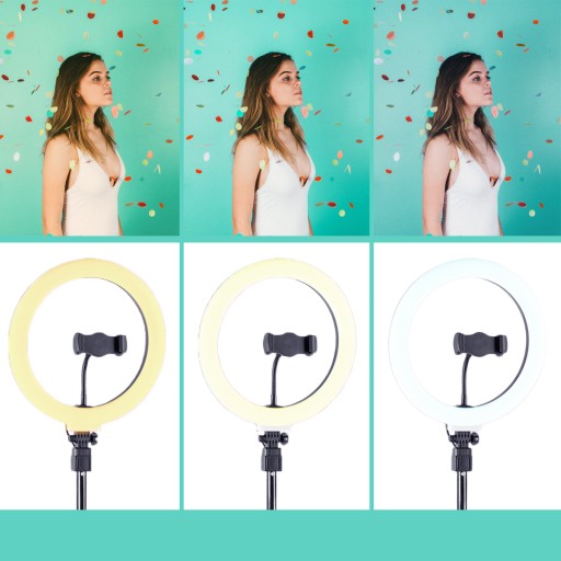 Lampa pierścieniowa ma 3 stopnie regulacji temperatury barwowej (zimną biel, mieszaną i ciepłą biel), które można zmieniać w zależności od pożądanego efektu.