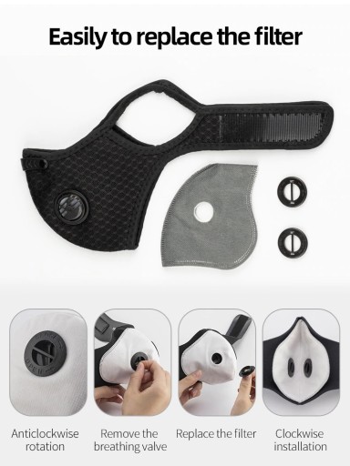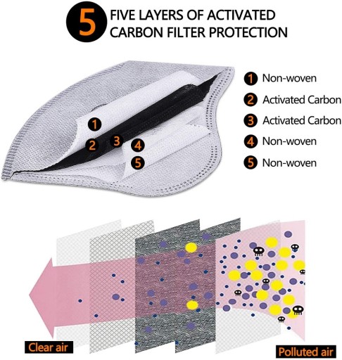 Wymienne filtry zapewniają dodatkowy poziom ochrony. To filtry N95/KN95/FFP2 HEPA z węglem aktywnym o dużej skuteczności filtrowania. Zatrzymują szkodliwe zanieczyszczenia, bakterie, cząstki nośników wirusów, pyły PM 10 i PM 2.5 oraz wiele innych mikroorganizmów, alergenów, spalin, pyłków roślin, kurzu, dymu tytoniowego itd. W sumie filtrują skutecznie ponad 130 toksycznych substancji. Filtry są wysokiej jakości – pięciowarstwowe. Jeden filtr wystarczy na ok. 30 godzin ciągłego noszenia. Taki filtr ma 5 warstw w tym przeciwkurzową, przeciwpyłową, aktywny węgiel. Filtracja jest na poziomie 95-98%. Filtry można szybko i łatwo wymienić poprzez odkręcenie trzymających go zaworków.