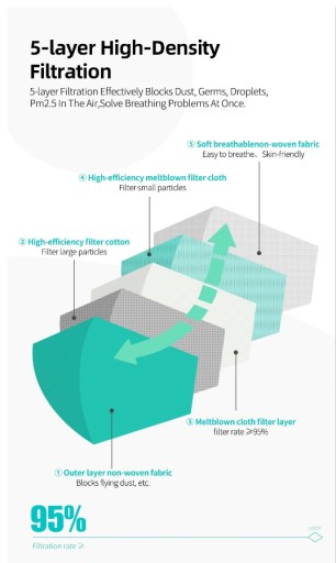 Wymienny filtr HEPA PM2.5 zapewnia dodatkowy poziom ochrony. Filtry są wysokiej jakości – pięciowarstwowe. Jeden filtr wystarczy na ok. 30 godzin ciągłego noszenia. Taki filtr ma 5 warstw w tym przeciwkurzową, przeciwpyłową, aktywny węgiel. Filtracja jest na poziomie 98-99%. Filtry można szybko i łatwo wymienić.