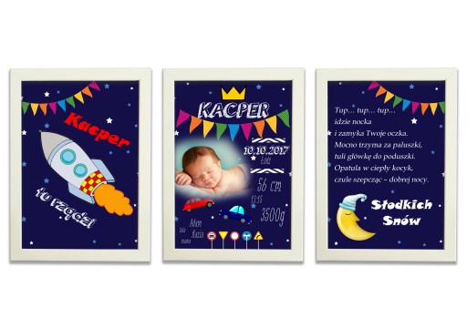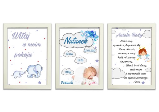W każdym zestawie znajduje się metryczka, czyli personalizowany plakat z danymi dziecka tj. imię, wagę czy długość podczas narodzin, wzory posiadają miejsce na wstawienie zdjęcia dziecka.