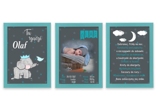 W każdym zestawie znajduje się metryczka, czyli personalizowany plakat z danymi dziecka tj. imię, wagę czy długość podczas narodzin, wzory posiadają miejsce na wstawienie zdjęcia dziecka.