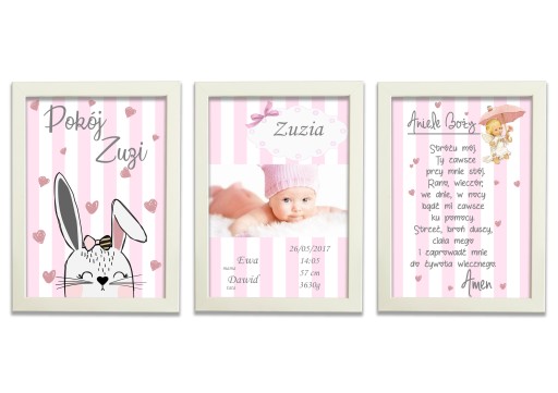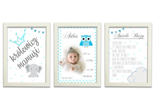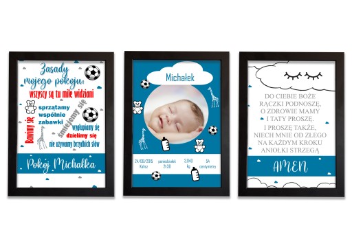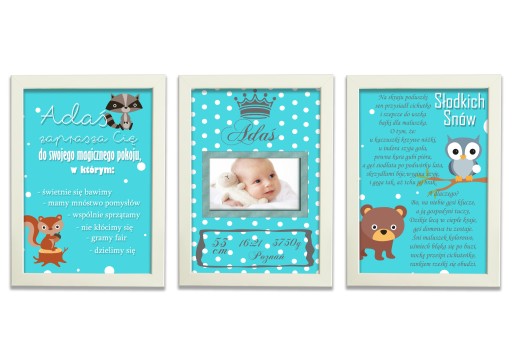 W każdym zestawie znajduje się metryczka, czyli personalizowany plakat z danymi dziecka tj. imię, wagę czy długość podczas narodzin, wzory posiadają miejsce na wstawienie zdjęcia dziecka.