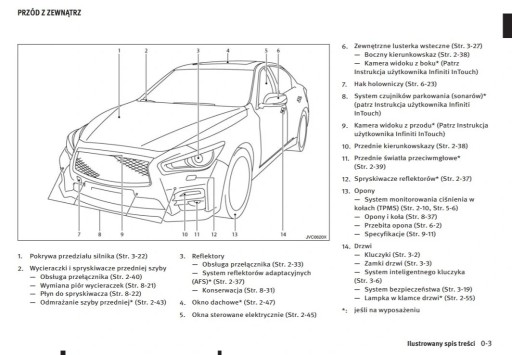 Instrukcja obsługi Infiniti zawiera wszystkie wersje wyposażenia oraz przydatne informacje jak sprawnie i bezpiecznie użytkować pojazd np.-wskaźniki, lampki kontrolne, otwieranie i zamykanie-oświetlenie i widoczność, fotele, schowki, ogrzewanie, wentylacja, klimatyzacja-jazda, wskazówki eksploatacyjne, konserwacja pojazdu-poziomy płynów, sprawdzanie i uzupełnianie, czynności awaryjne, wymiana kół, bezpieczniki, wymiana żarówek-dane techniczne... oraz wiele wiele innych rzeczy, które dają poczucie bezpieczeństwa oraz komfortu podróżującym. Polskie prawo nakłada na sprzedawcę obowiązek dołączania instrukcji obsługi auta w języku polskim do . Instrukcja obsługi auta jest nowa i w języku polskim.