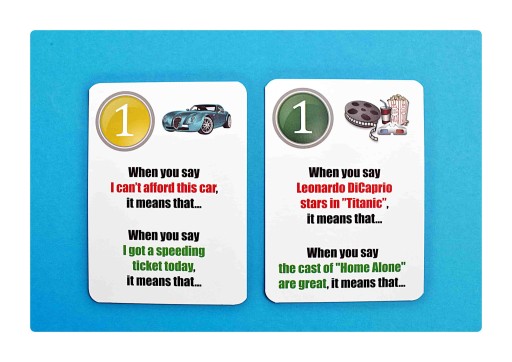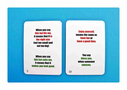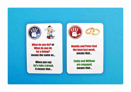 Zestaw zawiera 100 zwrotów niezwykle przydatnych w codziennych sytuacjach. Uczeń musi powiedzieć, w jakiej sytuacji używamy danego zwrotu lub wytłumaczyć jego znaczenie, przez co każda karta zmusza do mówienia. Karty mogą służyć jako fiszki lub jako ekscytująca gra do nauki języka angielskiego.