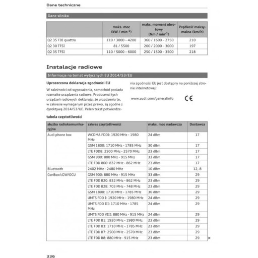 Instrukcja obsługi Audi z lat 2016 - 2020 Audi Q2 Q2 35 TDi quattro Q2 30 TFSI Q2 35 TFSI Strony - 352 Stan - nowy Rodzaj - książka Język - polski Edycja - 2020 Okładka - kolor Środek - czarno biały Papier - kreda mat A5 149x210