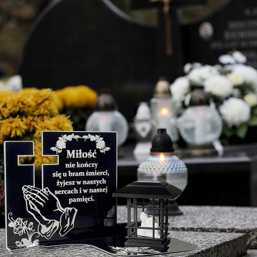 - Symboliczny Napis: Dołączona czarna tabliczka z białym napisem “Miłość nie kończy się u bram śmierci, żyjesz w naszych sercach i w naszej pamięci” dodaje głębi i wyraża uczucia pamięci.
