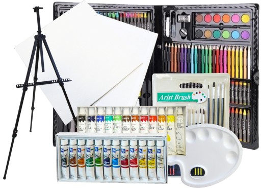 Przy pomocy dużego wyboru farb, kredek, pisaków, pasteli olejnych, pasteli suchych świecowych, farb akwarelowych, małego pędzelka, gąbeczki, ołówka, nożyczek, temperówki, kleju, linijki oraz kolorowych spinaczy a także akcesoriów takich jak podobrazia malarskie, zestaw pędzli, oraz SKŁADANEJ ALUMINIOWEJ SZTALUGI dziecko z łatwością stworzy najbardziej wymyślne, kreatywne i oryginalne prace.