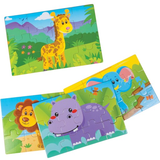 W zestawie znajdują się cztery 12-elementowe układanki- puzzle ze zwierzętami.