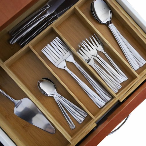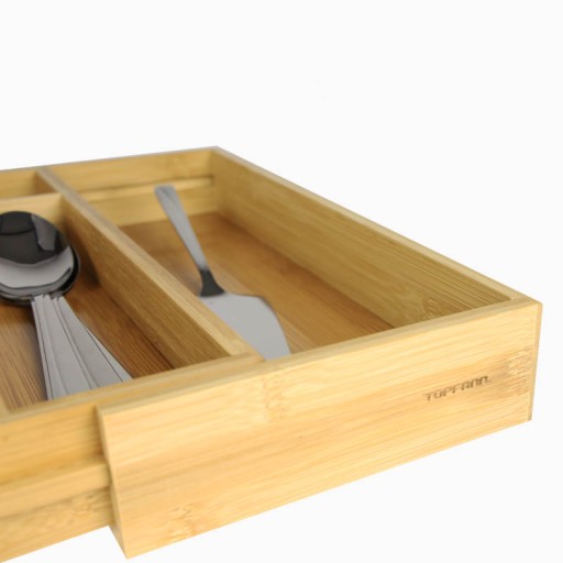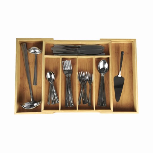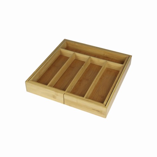 Regulowany bambusowy organizer to idealne rozwiązanie do uporządkowania każdej szuflady. Dzięki systemowi, który pozwala na rozłożenie dodatkowych 2 bocznych przegródek, nadaje się do szuflady o wymiarach szerokości 31,5 do 52 cm.