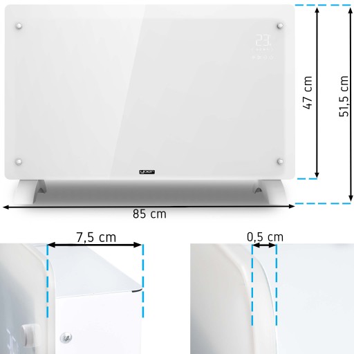 | Moc 2500W | Tryb ECO | Szklany | Timer 24h/7d | Termostat elektroniczny | Zakres temperatur 5 - 50°C | 2 sposoby montażu | 4 tryby pracy | 24h- programator czasowy | Wi-Fi | Dotykowy panel LED | Ochrona IP24 | Certyfikat CE |