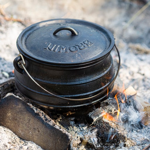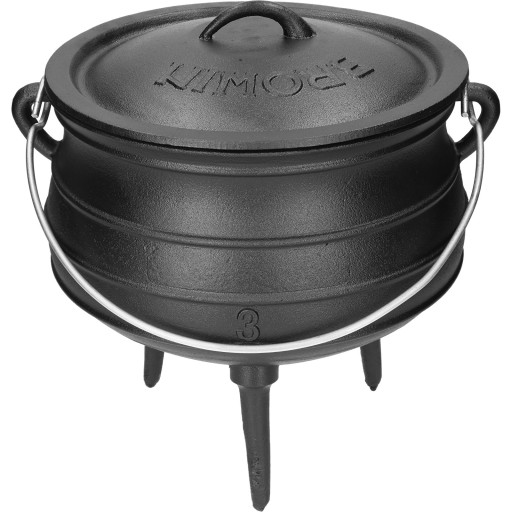Kociołek wykonany jest z wysokiej jakości żeliwa. Trzy stabilne nóżki, będące integralną częścią naczynia, umożliwiają bezpieczne ustawienie go na palenisku lub nad ogniskiem.