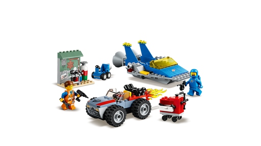 Przygotuj się do lotu w kosmos w warsztacie Emmeta i Benka z filmu LEGO® PRZYGODA 2™! Napraw narzędziami statek kosmiczny Benka i ucieczkowy łazik Emmeta. Zatankuj oba pojazdy i ruszaj w przestrzeń kosmiczną. A gdy odkryjesz nową planetę, możesz zwiedzić ją łazikiem!