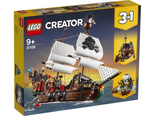• Zestaw LEGO® Creator 3 w 1 Statek piratów (31109) pozwala zbudować trzy modele: statek piracki, piracką karczmę lub Wyspę Czaszek. Każdym z nich można się bawić osobno albo połączyć go z innymi zestawami. W pudełku są też trzy minifigurki, które rozszerzają możliwości zabawy.