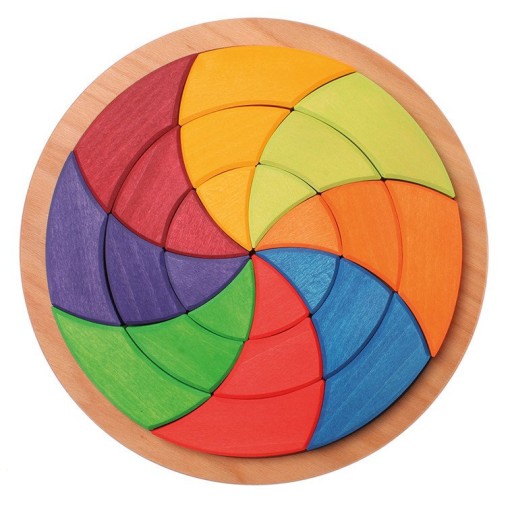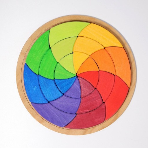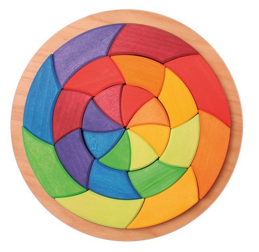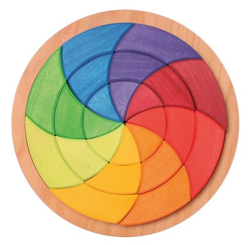 To okrągła podstawka, a w niej przepiękne klocki w intensywnych kolorach. Klocki tworzą tęczowe koło, które ma natychmiast wciągnąć dziecko do kreatywnej zabawy. Układanie klocków wymaga precyzji, jak klasyczne puzzle, jednak pozostaje całkowita swoboda co do sposobu ich układania.