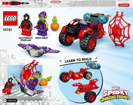 Podaruj odrobinę zabawy młodym pajęczym bohaterom dzięki temu ciekawemu zestawowi LEGO® Marvel z pojazdem Spider-Mana. Zestaw Miles Morales: Technotrójkołowiec Spider-Mana (10781) doskonale sprawdzi się jako prezent bez okazji i zachęci dzieci do pomysłowej zabawy. Fani Marvela mogą odgrywać emocjonujące scenki pościgów, podczas których Miles Morales przypiera Zielonego Goblina do muru i strąca go z maszyny latającej wystrzeloną pajęczyną. Proste modele dla fanów Spider-Mana Zestawy LEGO 4+ zawierają zmyślne elementy, które zapewniają chłopcom i dziewczynkom świetną zabawę. Przydatny klocek startowy pełni funkcję solidnej podstawki konstrukcyjnej i pozwala dzieciom szybko rozpocząć zabawę z udziałem superbohaterów. Najlepsza zabawa dla całej rodziny Dzięki zestawom 4+ dorośli mogą budować razem z dziećmi. Osoby, które nigdy wcześniej nie miały styczności z klockami LEGO, nie muszą się niczym przejmować — ten zestaw z superbohaterami zawiera ułatwiające budowanie ilustrowane instrukcje, więc nawet dzieci, które dopiero uczą się czytać, poradzą sobie ze złożeniem modelu.
