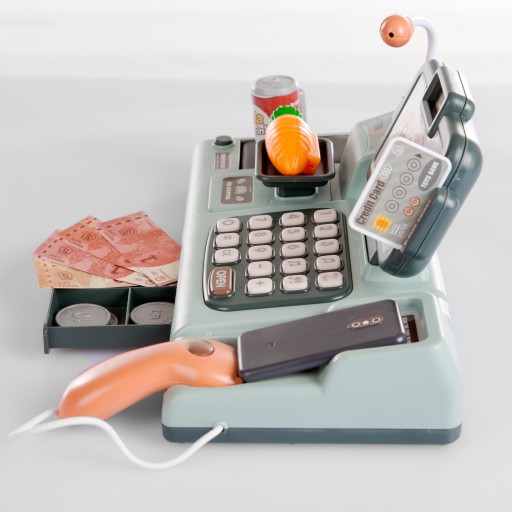 Edukacyjna kasa fiskalna posiada także funkcjonalny terminal, który podczas nabijania cen wydaje charakterystyczny dźwięk. Podczas zabawy klient może płacić zarówno kartą, jak i pieniędzmi w postaci banknotów i bilonów. NOWOŚĆ - możliwość płacenia telefonem (telefon w zestawie).