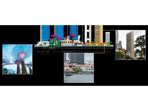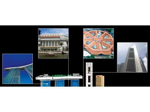 • Słynne miejsca zbudowane z klocków — Ośrodek wypoczynkowy Marina Bay Sands, wieżowce OCBC Centre i One Raffles Place, targ Lau Pa Sat (znany również jako targ Telok Ayer), hotel Fullerton oraz ogrody Supertree Grove w parku Gardens by the Bay