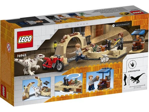 Przygotuj się na pełną emocji zabawę tym cudownym zestawem LEGO 76945 inspirowanym filmem „Jurassic World Dominion”. Zestaw zawiera targ z murem, przez który mogą się przebić atrociraptor i fantastyczny motocykl, a także arenę dla dwóch figurek małych dinozaurów. Są tu też minifigurki Owena Grady’ego i Rainna Delacourta.