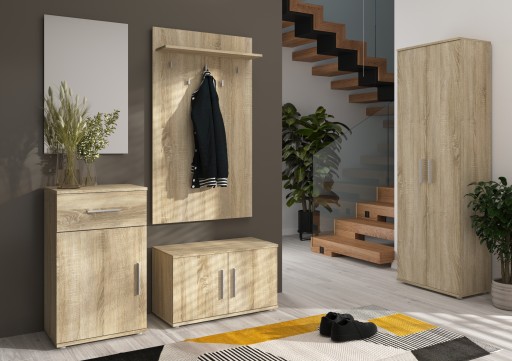 Szafkę na buty można kompletować z innymi meblami z kolekcji Valencia, tworząc kompatybilny zestaw do przedpokoju.