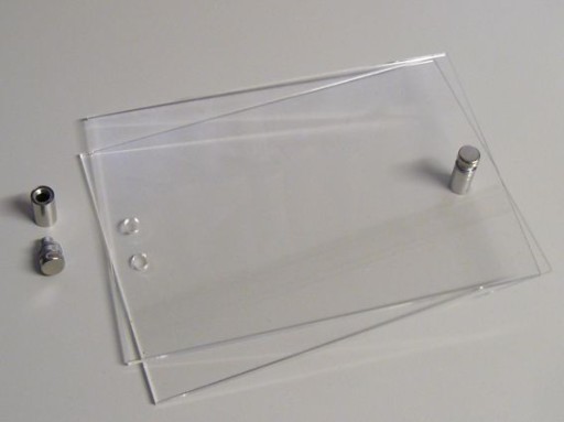 Tabliczka przy drzwiowa wykonana jest z dwóch płytek plexi bezbarwnej o grubości 3 mm, pomiędzy które można zamieścić kartkę z dowolną treścią. Zaopatrzona jest w dwa dystanse ułatwiające przymocowanie tabliczki, które dodatkowo dodają jej elegancji.