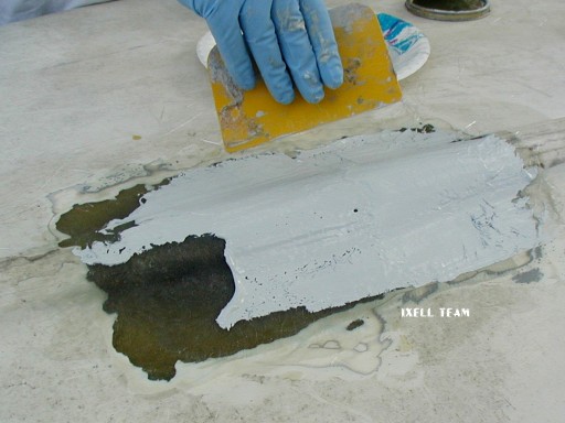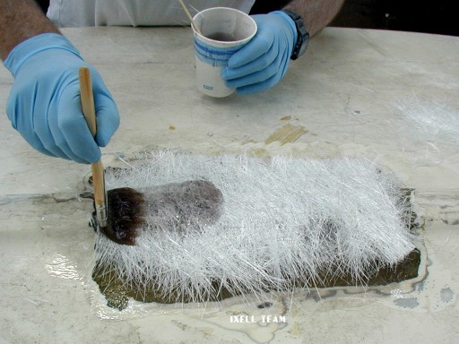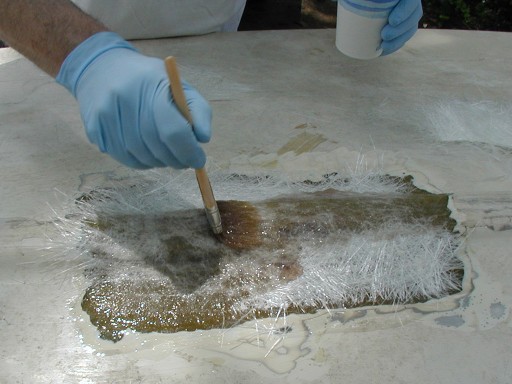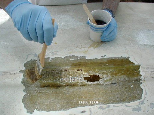 W ciągu maksymalnie 10 minut (przy 20 st C) nanieść żywicę na oczyszczone miejsce. Następnie nałożyć i docisnąć pędzlem lub wałkiem przyciętą matę i ponownie nanieść żywicę.