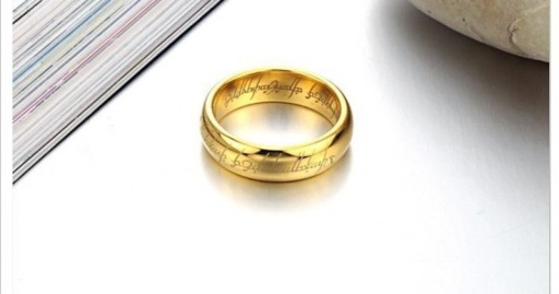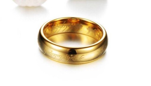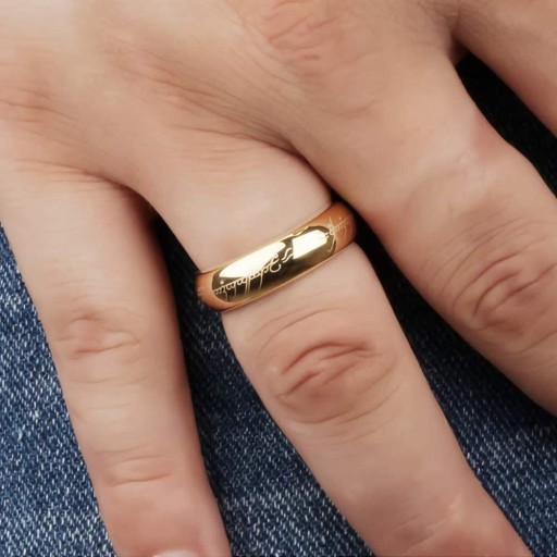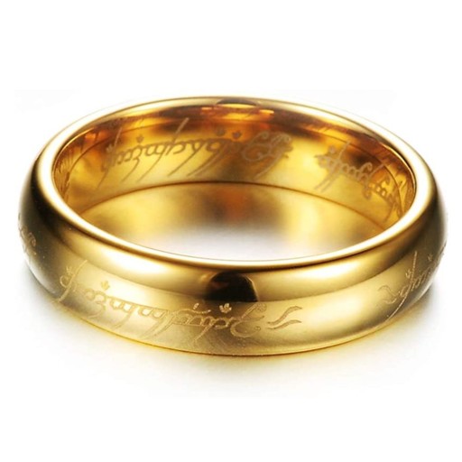 Stylowa obrączka wykonana z wysokiej jakości węgliku wolframu, który charakteryzuje się niezwykłą twardością oraz odpornością. Na zewnętrznej jak i wewnętrznej stronie obrączka posiada laserowo wygrawerowany motyw z filmu Władca Pierścieni. Zewnętrzna jak i wewnętrzna powierzchnia produktu jest wypolerowana, o wysokim połysku i błyszczącym wykończeniu. Kolor złota zawdzięczany jest anodowaniu trwałą metoda Ion Plating, która pozwala cieszyć się powlekaniem bez obaw o jego starcie. Obrączka cechuje się łagodnie zaokrąglonym profilem oraz soczewkowym wnętrzem, które zwiększa komfort i wygodę przy użytkowaniu. Niespotykany, unikalny wzór zwracający uwagę, który będzie świetnym dodatkiem zarówno do codziennej, jak i wyszukanej stylizacji dla miłośników The Lord of the Rings.
