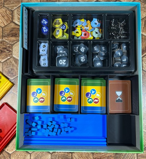 Insert wykorzystuje dostarczone z grą pojemniki, ale też oferuje sporo dodatkowego miejsca - zostało ono pomyślane na ewentualne dodatki, oraz dla wszystkich tych, którzy (tak jak ja) uwielbiają upiększać swoją grę na przykład modelami kiosków i pawilonów.