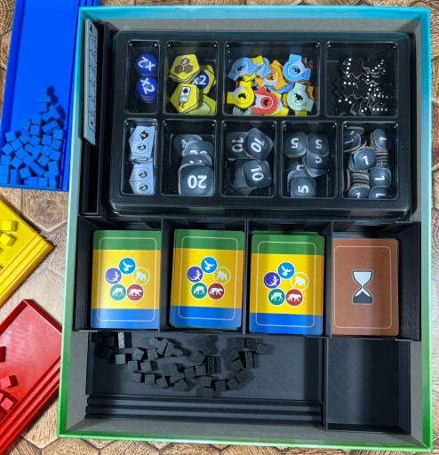 Insert posiada 4 przegrody na karty zaprojektowane tak, by pomieścić zakoszulkowane karty. Dodatkowo dwa pojemniki na karty zostały opracowane tak by ułożyć je bezpośrednio na planszy gry i mogły służyć za talię kart zoo i stos kart odrzuconych.