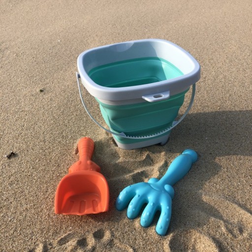 Góra, spód i rączka wiaderka są plastikowe, a ścianki wykonane są z grubego silikonu składanego harmonijkowo. Plastikowe są również grabki i łopatka.