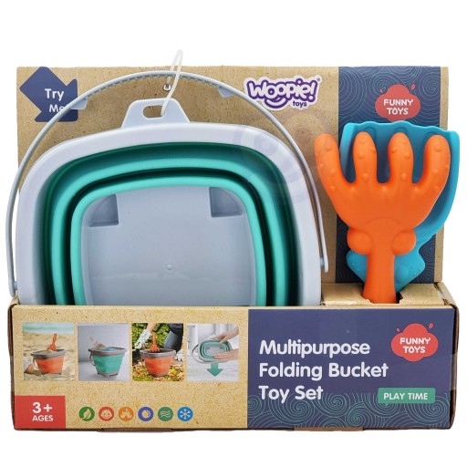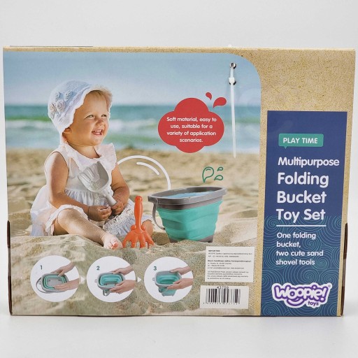 Silikonowe wiaderko z grabkami i łopatką od marki WOOPIE. Fantastyczne wiaderko do piaskownicy, na plażę lub do ogrodu, dzięki któremu dzieci miło spędzą czas na świeżym powietrzu.Wiaderko, dzięki składanej konstrukcji, zajmuje niewiele miejsca, jest łatwe w transporcie i wygodne do przechowywania.Zestaw zmieści się do dziecięcego plecaczka, do wózka czy plażowej torby.