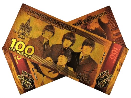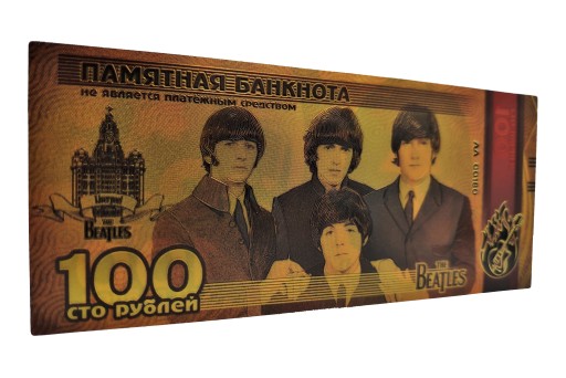 Piękny pozłacany banknot z wizerunkiem Johna Lennona oraz zespołu The Beatles.