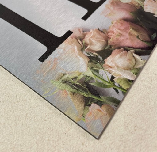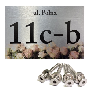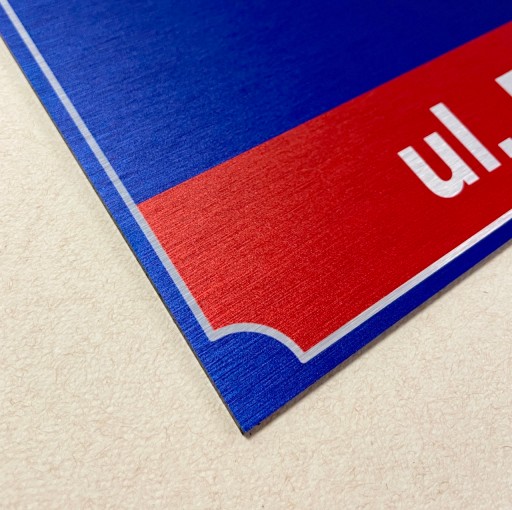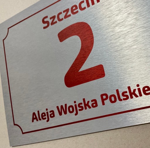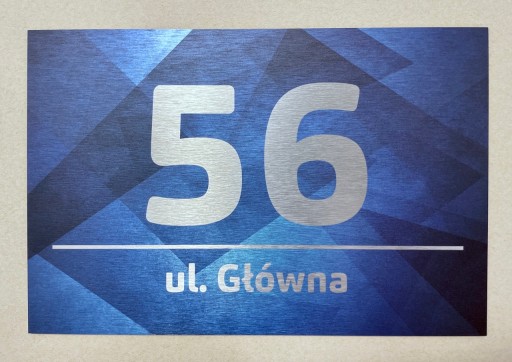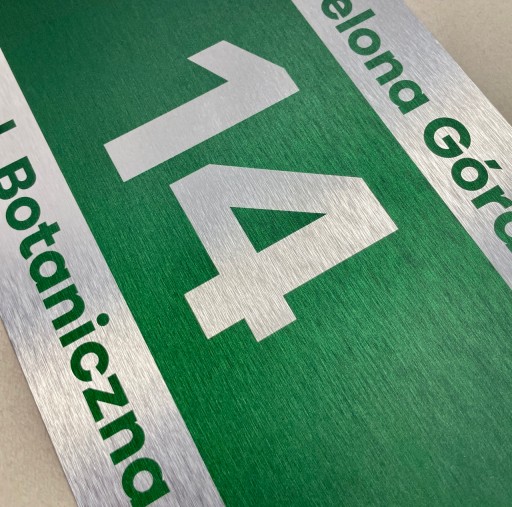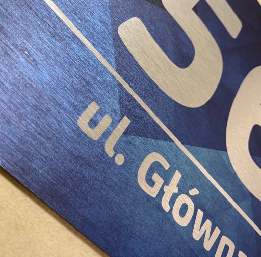 Tabliczka adresowa wykonana z kompozytowej płyty typu Dibond wykończony szczotkowanym aluminium z kolorowym nadrukiem UV.