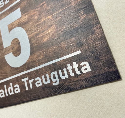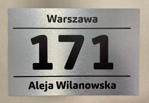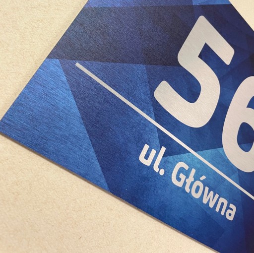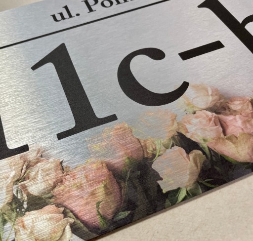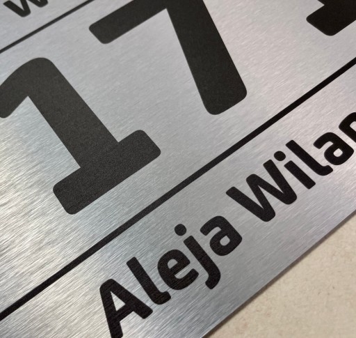Tabliczka adresowa wykonana z kompozytowej płyty typu Dibond wykończony szczotkowanym aluminium z kolorowym nadrukiem UV.