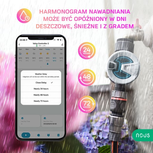 Tryb inteligentnego sterowania nawadnianiem może wykryć prognozę pogody w czasie rzeczywistym i automatycznie dostosować harmonogram nawadniania lub uruchomić opóźnienie nawadniania na skutek deszczu w zależności od pogody, wilgotności gleby i innych warunków. Można również ręcznie włączyć opóźnienie na 24, 48 lub 72 godziny. Dzięki temu można zaoszczędzić nawet do 50% na kosztach wody miesięcznie.