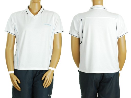 Kolor: biały z granatowymi i niebieskimi paseczkami. Na piersi wyszyte firmowe logo w kolorze niebieskim.