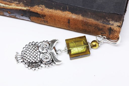 Elegancka zakładka do książki z zawieszką w kształcie sowy z dodatkiem zielonego szkła weneckiego oraz ze złotym hematytem.