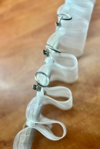 ⭐️za pomocą agrafek, które najpierw wpinamy w specjalne kieszonki, a następnie agrafkę zapinamy na kółko od karnisza lub wprowadzany w szynę. 2 rzędy na haczyki